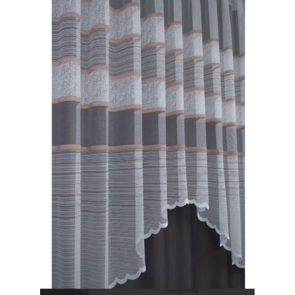 Жаккардовая тюль арка - красивая ткань с сетчатым узором в виде коричневых полос и чистого поля. Это полотно со свисающими краями и укороченная по центу, что предает форму арки. Тюль очень красиво смотрится на окне, особенно практична на кухне, так как не крадет пространство на подоконнике, а дает ощущения достаточного пространства и при этим делает стильным любое окно, будь то кухня, веранда или балкон.